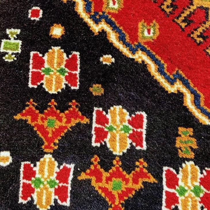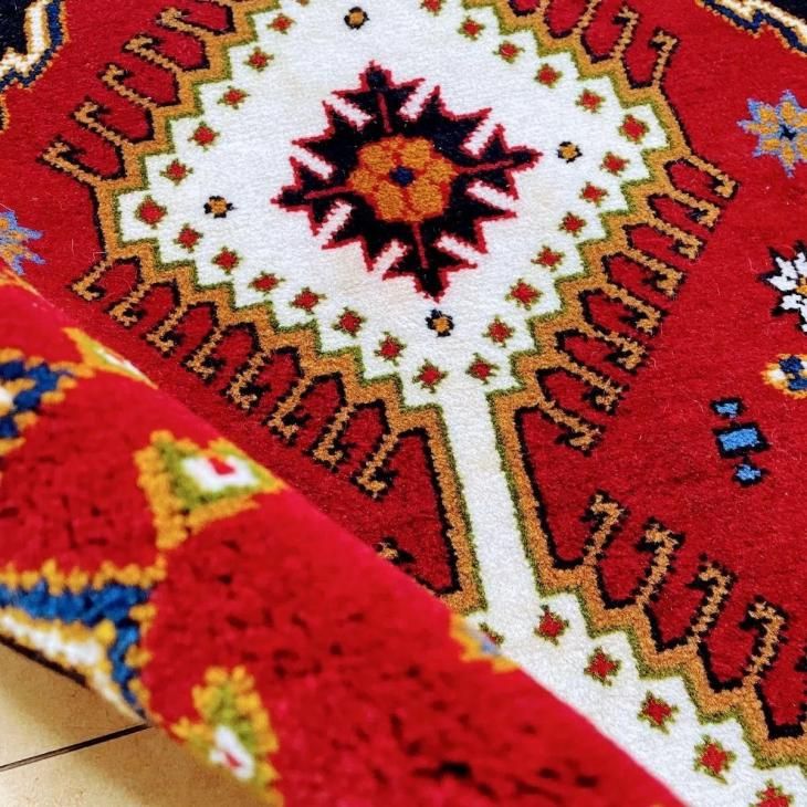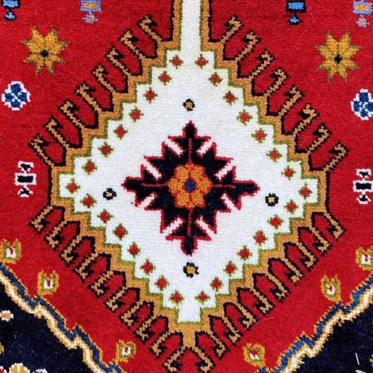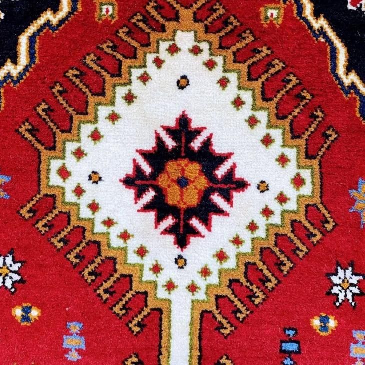 ヤラメは数ある産地の中でも、ギャッベやキリムも織られる地域です。そのため編まれるペルシャ絨毯の模様にギャッベやキリムにも通じるダイヤのメダリオンや、幾何学的な模様が描かれています。